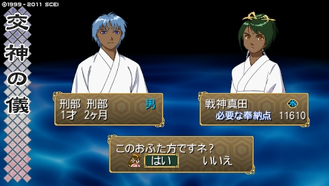 交神相手は友人宅から勧請した氏神様。刑部家と真田家のコラボですよ!(だからなんだと言われればそれまでなんですけど)こんなことなら大谷家にしとけばより分かり易かったですな・・・もっと言うなら初代名猿飛佐助にしとけば猿飛家と真田家のコラボでより熱い感じに・・・さもなくば友人に泣きついて真田家じゃなくて石田家で始めてもらえば・・・すいませんね、頭が沸いててね。まあ刑部家始めた時点で頭沸いてるも同然でしたけどね。