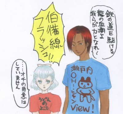 Tシャツの柄は適当に考えました。総社のシャツに描いてある不気味生物は岡山香川で大人気のテレビ局のイメージキャラクター・OHくんです。本物はきちんと可愛いんですよ。イメージソングまであるし。すごくいい曲ばかりなんでぜひニコニコ動画あたりで「ケダマ」といれて検索していただきたい(リンク張れよ)。