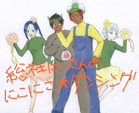 邑久の子孫達も出張っちゃいます。すいません、これ実はお祝い用に描いたものではなく、いつだったか眠れなくて午前四時から描き始めて午前六時ごろに描きあげたブツです(最低)。日の目を見る可能性はほぼゼロだったんですが、折角の機会に便乗してみました。中和と久世は邑久の直系の子孫で、総社は邑久の孫・備前の孫、清音は上の絵の長船の血と、総社の祖父・備前の息子で久世の祖父に当たる備中の血を引いています。ややこしいな・・・一色家でもそうだったんですが、拙宅では弓使いが氏神になる可能性が高く、必然的にどの家系ももれなく弓使いの血を引く結果になります。あと余談ですが、中和の着ぐるみは平井堅の『POP STAR』のPVに出てたモグラをモデルにしました(ほんとどうでもいいね)。