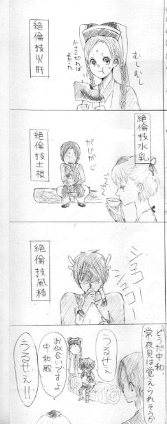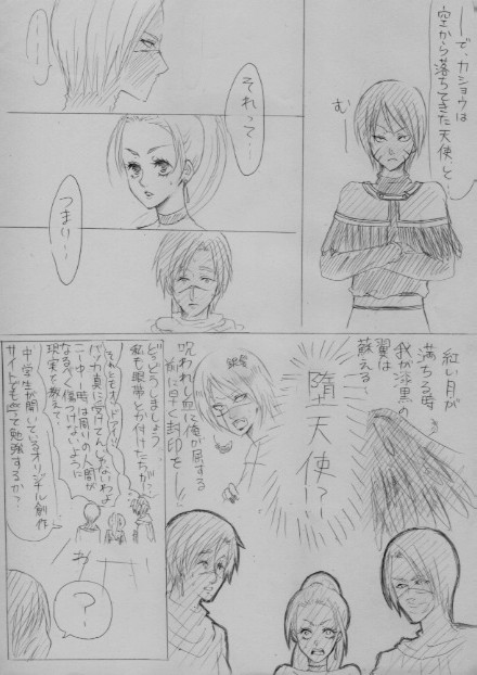 何度写メ撮っても上手くいかないので漫画描いてみました。カショウの服以外はゲーム中の装備じゃなくて、オリジナルです。センスの悪さが光ってるでしょ。
