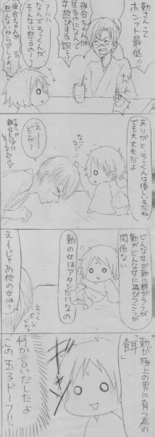 フォルダからサルベージ(取り込んでそのまま放置)。禄郎と夜合の仲良しっぷりを描くのが好きです。四兄弟は四兄弟で楽しいんだけど、あいつらの仲良しさは時たま気持ち悪い。