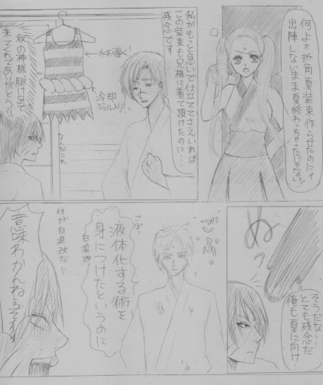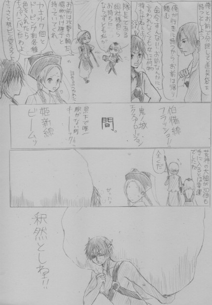 晴国家クリア面子で俺屍あるあるネタに挑戦の巻。どなたか描いてそうなネタですけども。夏は何だか晴国家が描きたくなる。夏生まれの一族だからでしょうか。