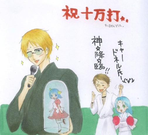 百鬼家のあん畜生。絵は使いまわし。大分長いこと御礼絵に鎮座してました。どなたも覚えてはいらっしゃるまい、というか忘れていて欲しいオリジナル設定として、うちに生まれてくる風目の鼻傷はみんな総一郎、というのがあります。