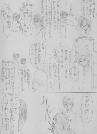 久々にモノクロ漫画。あのですね、以前某様が「青龍甲をイメージした鎧」というのを描いておられたのです。そのときは何にも思わなかったのですが、この前遥か4をしていて玄武が出てきた時「そういえば玄武って亀なんだよなぁ・・・じゃあ玄武甲って・・・」という流れで生まれたネタです。つうか端っこが所々切れていて読みにくいですね、すみません(汗)。