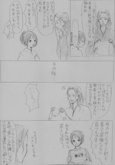 それはどうでもいいとして、あの女バトンの決まり事読み上げるの忘れてやがった。なんかいかにも頭に蒲公英でも生えてそうだったからな・・・あいつ兄貴の直系で、しかも凱の血も混ざってんだろ?変人と鈍臭いのが混ざるとあんなんになるんだな・・・まあ子孫がどうなろうが俺にゃ関係ねぇし、自分の子供にも会えずじまいだった俺が何か言えた義理じゃねぇよ。それはそうと、バトンの決まり、書いとくぜ。