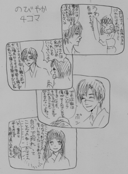 開き直って総の科白を思うままに書いたら、案の定凶悪でした。時々出てくる総の長女・絵麻(漫画の中では字間違えてました)と、最後のコマでちょこっと出てくる次女・邑野。生前に生まれた娘三人は全員風目で、嬉しかった思い出が。