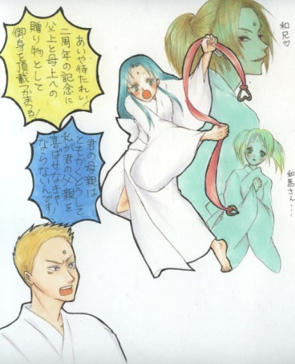 特に意味は無い落書き。両親が愛し合っていなくてもいいというのは一族においては暗黙の了解だけども、両親が同じ人を好きというのはなんともカオス・・・(笑えない)。同じく和馬の闇に惹かれたのでも、歌代子のは献身的な庇護欲で董火のは同族意識。なんて事ない絵ですが、歌奈子のポーズとかいい感じに描けたなと悦に入ってます。